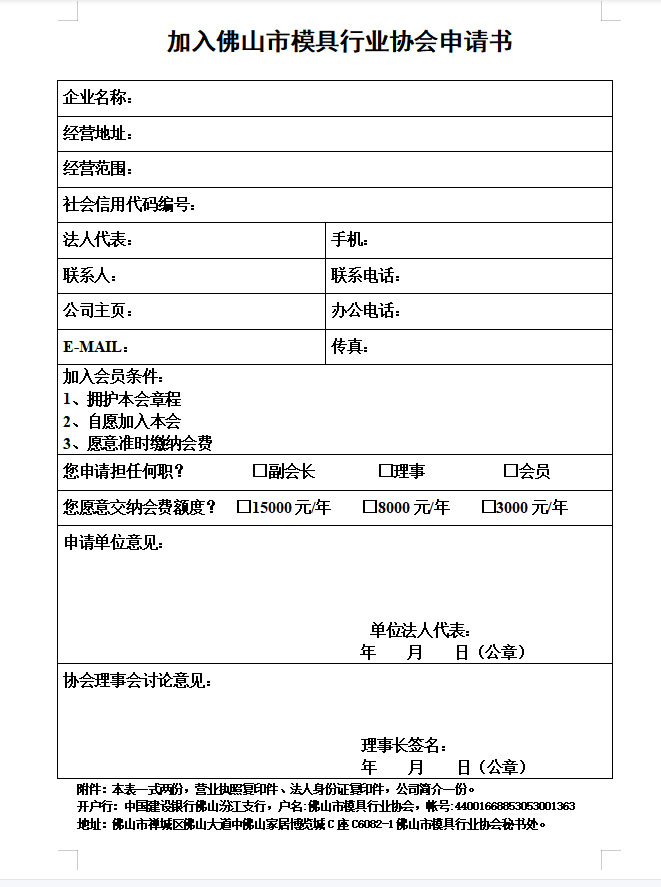 1.欲加入佛山市模具行業協會的單位,應由法人代表或委托人向協會秘書處申領入會申請表。