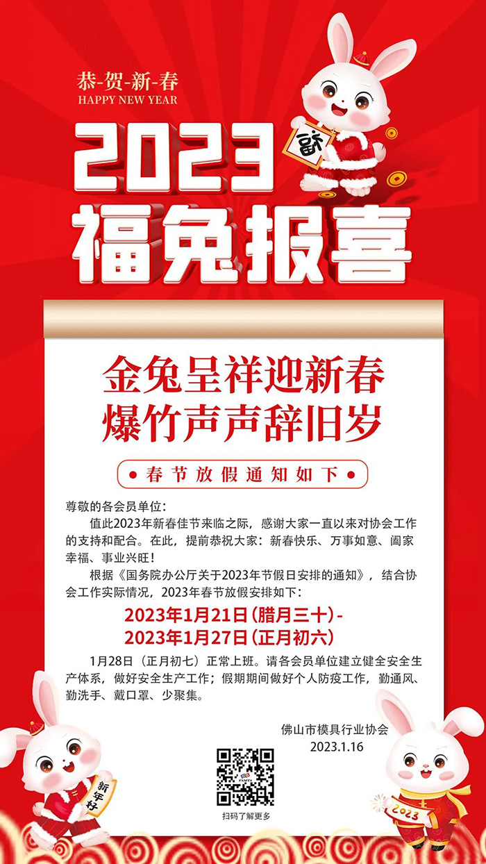 2023新年到來之際,我代表佛山市模具行業(yè)協(xié)會,向一直以來關(guān)心支持協(xié)會工作的各級領(lǐng)導和社會各界、全體會員單位、廣大企業(yè)家致以崇高的敬意和誠摯的感謝!