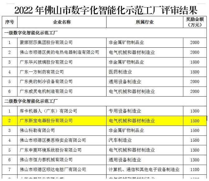 我會副會長單位 廣東新寶電器股份有限公司 入選二級數字化智能化示范工廠,獲得1500萬元獎勵。