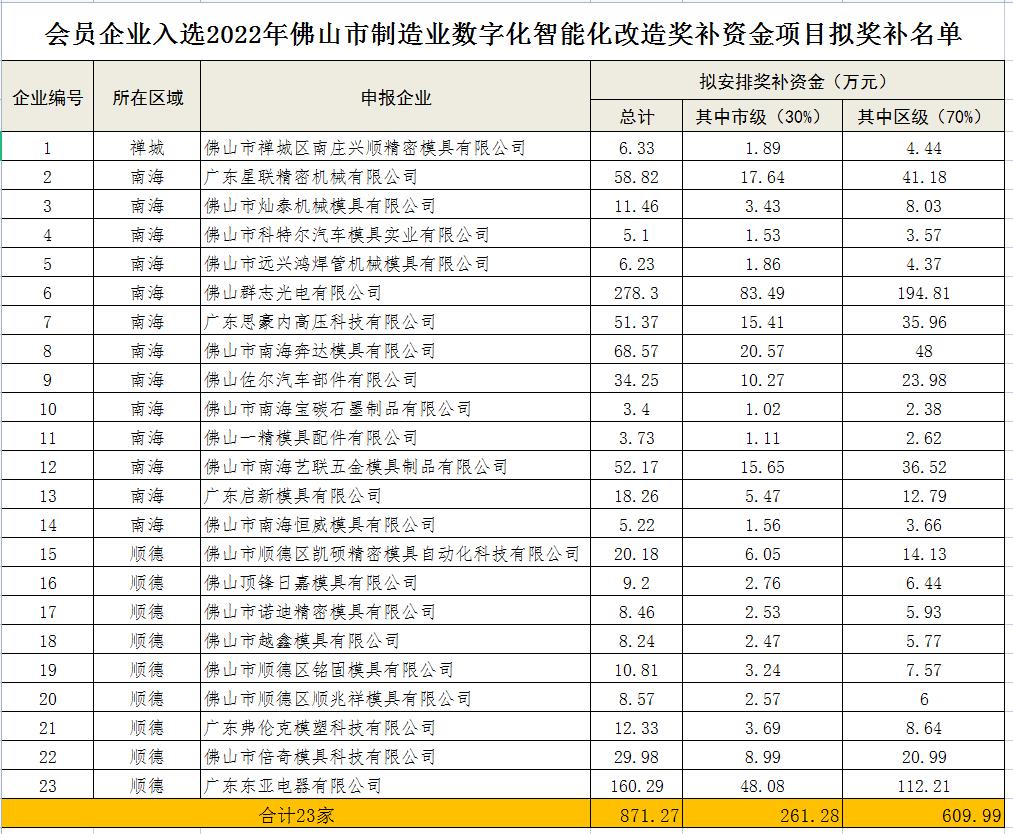 佛山市工業和信息化局關于2022年佛山市制造業數字化智能化改造獎補資金項目擬獎補名單的公示
